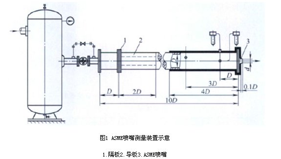 常用的節流測量裝置有:ASME噴嘴測量裝置、ISA1932噴嘴測量裝置、孔板測量裝置和文丘里噴嘴測量裝置。其中ASME噴嘴和ISA1932噴嘴測量裝置的氣體流出系數值較大,精度也較高,使用也較多。ASME噴嘴測量裝置由于氣體通常直接排空,且要求測量噴嘴壓差的壓差計量程較小,因此測量大流量時,該裝置的尺寸也比較大,不便于移動測量,如圖1所示。