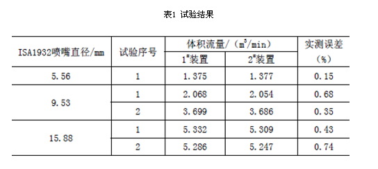 在進行兩套ISA1932噴嘴測量裝置(1#裝置與2#裝置)之間對比時,分別對直徑為5.56mm、9.53mm和15.88mm的噴嘴進行試驗。試驗結果見表1。