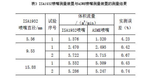 最后將ISA1932噴嘴測量裝置與ASME噴嘴測量裝置的測量結果進行比較。由于兩套ISA1932噴嘴測量裝置一致性良好,用于比較的是兩套裝置測量結果的平均值。試驗結果見表3。