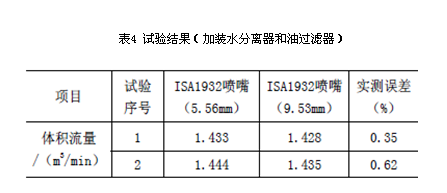 測量結果表明在安裝水分離器和油過濾器后,測量數據與真實值保持一致,誤差也在允許范圍以內。因此,對于ISA1932噴嘴以及同原理的孔板等安裝在管道內的測量裝置,其上游應加裝水分離器和油過濾器,保證氣體具有一定的潔凈度。同時在試驗過程中,發現壓力的偏差對于該類裝置的測量結果影響較大,為保證測量精度,應選擇0.4級或等級更高的壓力表或壓力傳感器。