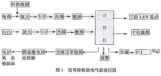 將來自氧量檢測器的模擬信號(氧勢、熱電勢)分別調制成0-10KNz調頻信號,經光電隔離后送至計算機,采用調頻方式能將儀表輸入、輸出相互隔離,這樣就消除了諸如大電流跳變所引起的干擾,能夠克服高共模電壓,因而大大提高了儀表的抗干擾能力。應用程序主要由主程序和子程序組成,所有的程序都采用模塊結構編制,便于修改、增加軟件功能,以滿足不同用戶的特殊需要。程序運算采用了三位浮點數,保證了運算勞動精度,對氧濃、爐溫的計算,采用查表線性插值法,對爐溫的控制采用增量式PID算式控制。信號轉換器的電氣原理框圖見圖1