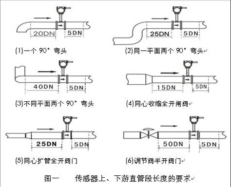 2、渦街流量傳感器的上游側和下游側應有較長的直管段。其上、下游直管段長度根據管道狀況不同而不同,直管段的具體安裝長度和要求見下圖。