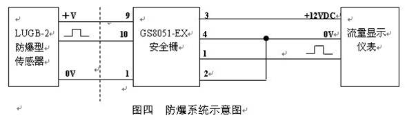 防爆型傳感器必須與合適的關聯設備——安全柵組成本質安全型防爆系統 (見下圖),通過電源信號安全柵再連接到流量顯示儀表上。