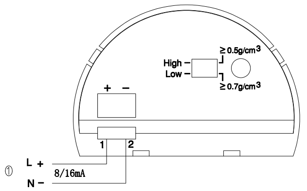 ①密度開關 ② 高低位模式 ③ 指示燈 ④ 接線端子 ⑤ 接地端子