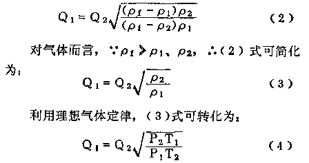 如果兩種不同密度ρ1、ρ2的介質分別通過同臺轉子流量計時,若浮子平衡在同一位固上,由(1)式得轉子流量計密度換算的基本式: