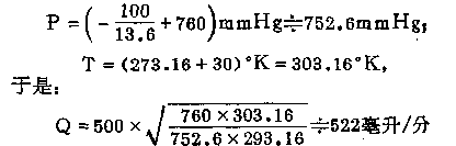 例:使用某空氣采樣儀,運行時,采樣儀上轉子流量計讀數為500毫升/分,測表前壓為—100mmH 20(因使用抽氣泵,所以是負壓),現場溫度為30℃,求此時空氣的實際流量值。