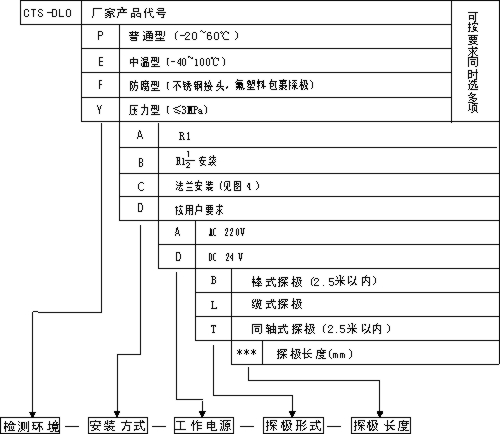 例1:使用要求:介質常溫、常壓;R1 安裝;電源AC220V;棒式探極,長1米。