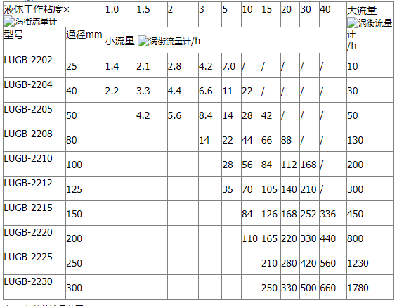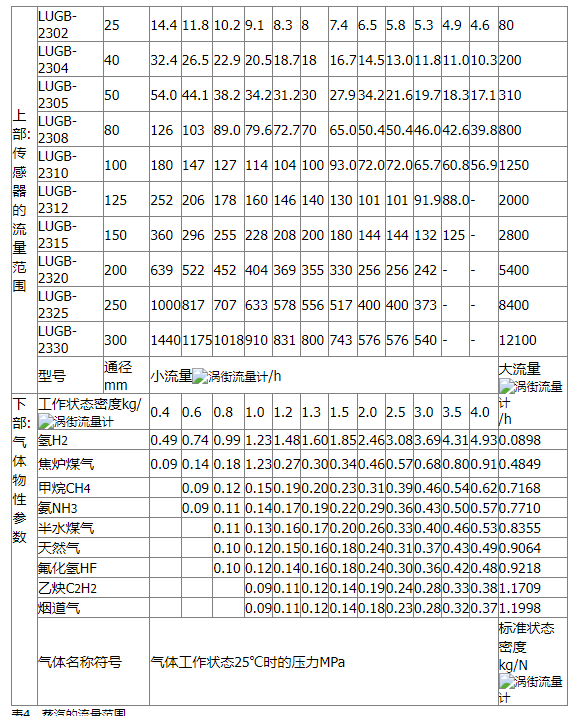 LUGB/E系列渦(wo)街(jie)流量儀表參比條件下渦(wo)街(jie)流量傳(chuan)感(gan)器工況流量范圍表