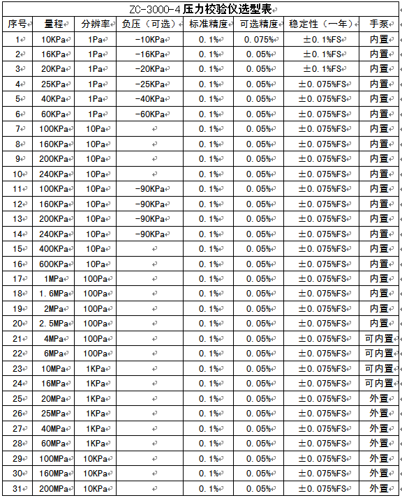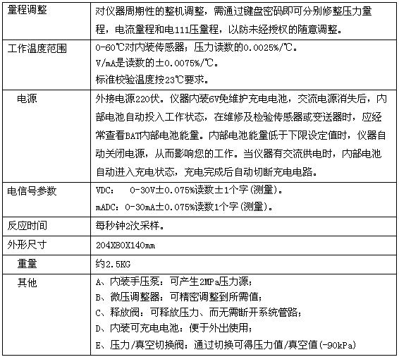 ZC-3000-4壓力校驗儀測量壓力精度為±0.1%-±0.05%。在測試過程中校驗儀為傳感器或變送器提供24V回路電源,并測量它們的輸出值。儀器在微處理機的控制下提供了許多優點,如:測量壓力單位的轉換,測量電參數的轉換,文件菜單內多種數據的設定,被檢傳感器或變送器的數據記錄、查詢等。同時儀器的可靠性和適用性大大提高,微處理器所包含的軟件完成了傳感器線性化和失調校正,并通過鍵盤對儀器進行精確校驗操作。