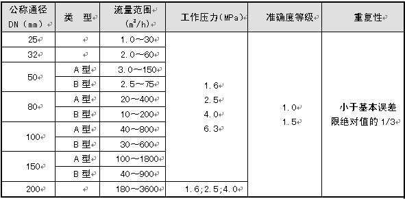2.1流量計規格、基本參數和性能指標(見表1)