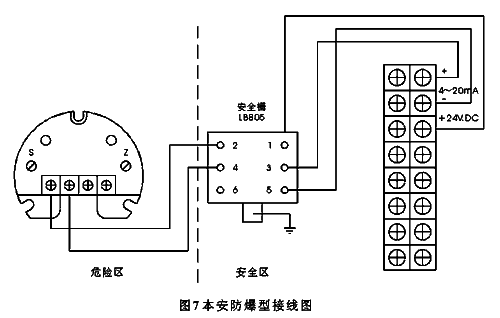 在磁性浮子液位計上安裝變送器。變送器由傳感器和轉換器兩部分組成,它通過磁浮子上下移動,經磁耦合作用使導管內測量元件依次動作,獲得電阻信號變化,傳喚成0~10或4~20mA的標準電流信號輸出,以便與數字顯示儀表或計算機聯接,實現遠傳顯示及控制。